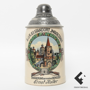 Описание: пивная керамическая кружка с цветным подглазурным узором, германский сувенир из блокады города Ленинград в период 1941-43 гг., на основании расположено клеймо захваченной мануфактуры в поселке Саблино (Sablino), где размещало свои заказы на сувенирную продукцию командование подразделений Вермахта и Войск-СС, непосредственно участвующих в осаде города, высота - 11 см.