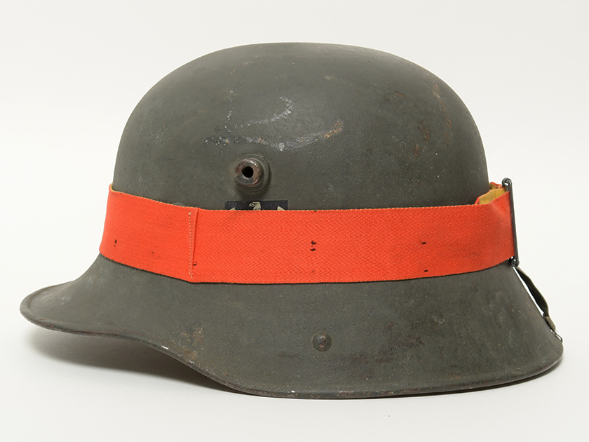 Историческая справка: шлемные повязки использовались для тактических учений. Когда части германской армии участвовали в показательных маневрах или военных учениях, маневры организовывались таким образом, чтобы они максимально напоминали боевые условия. Для этого принимавшие в них участие войска делились на две противоборствующие части. Чтобы их различать, на шлемы надевались специальные учебные повязки, желтые с одной стороны и красные с другой. В зависимости от того, каким образом повязка крепилась к шлему, наружная ее сторона была либо красной, либо желтой.